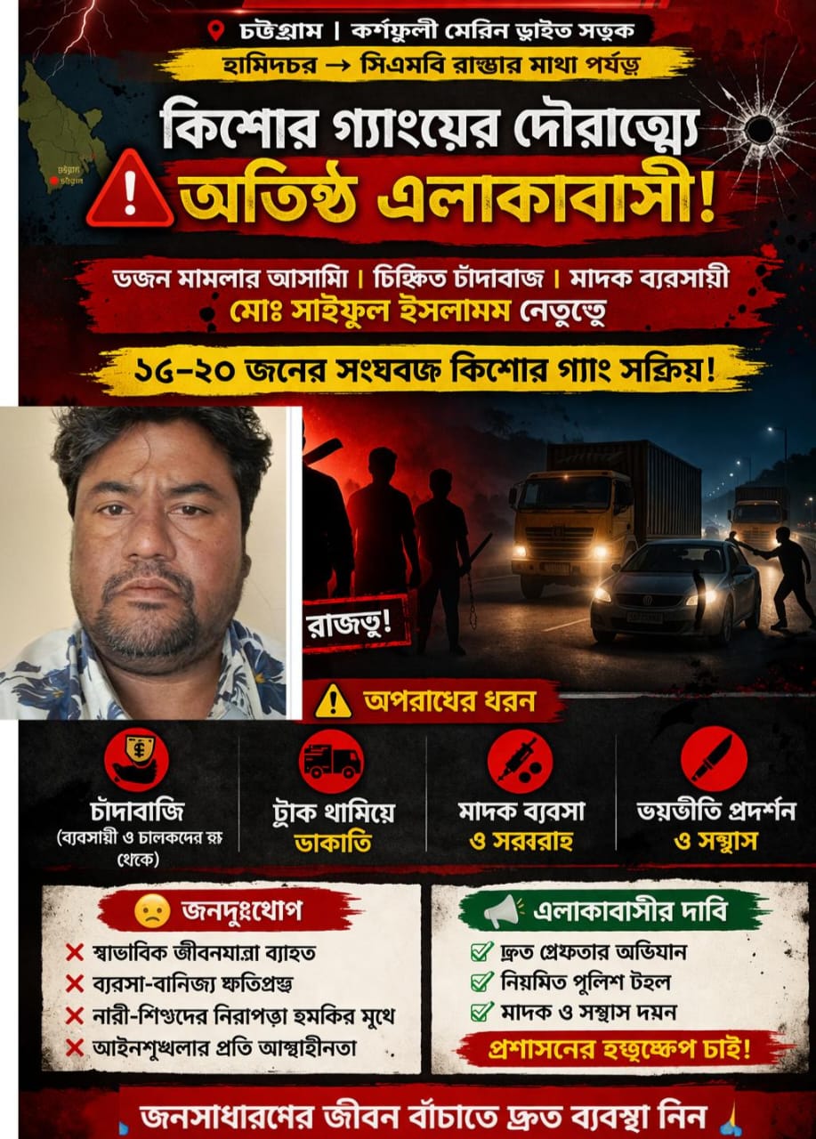চট্টগ্রামের মেরিন ড্রাইভ এলাকায় ডজন মামলার আসামি সাইফুল গং এর চাঁদাবাজি, ডাকাতি, মাদক ব্যবসায় অতিষ্ঠ এলাকাবাসী।